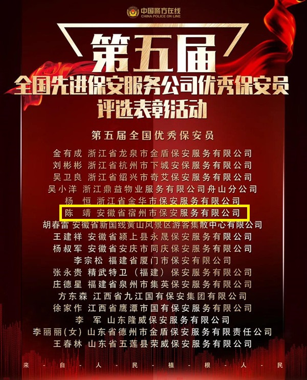 在第五届全国及全省先进保安服务公司和优秀保安员评选活动中,陈靖同志获评全国优秀保安员、公司获评全省先进保安服务公司、张万成获评全省优秀保安员。